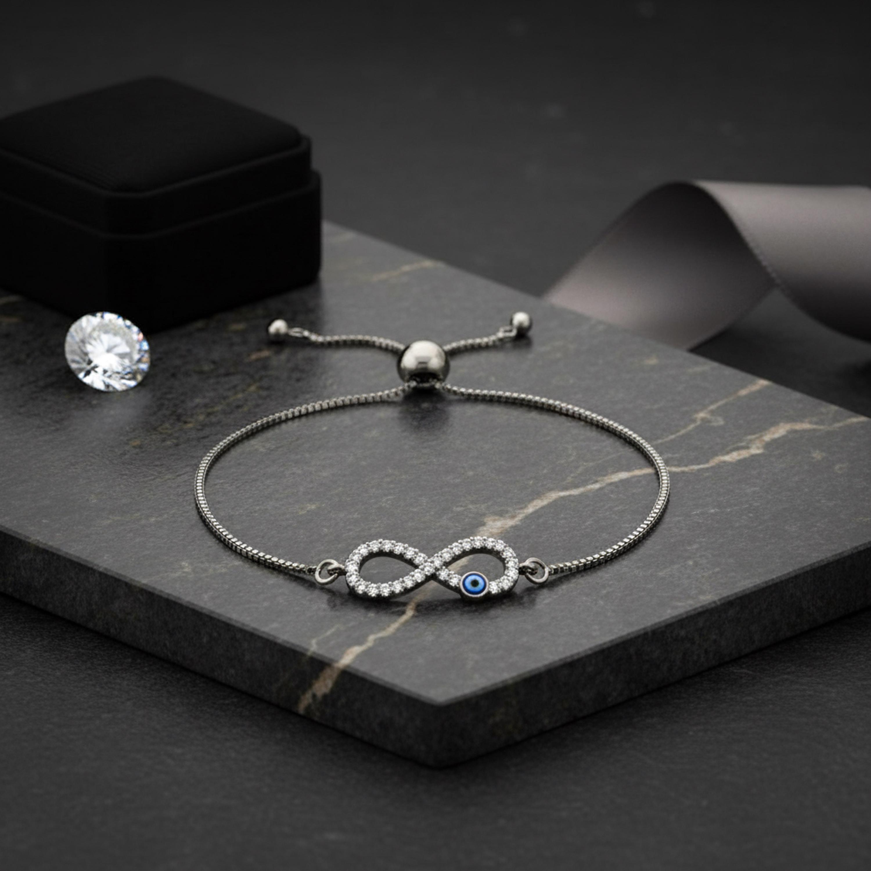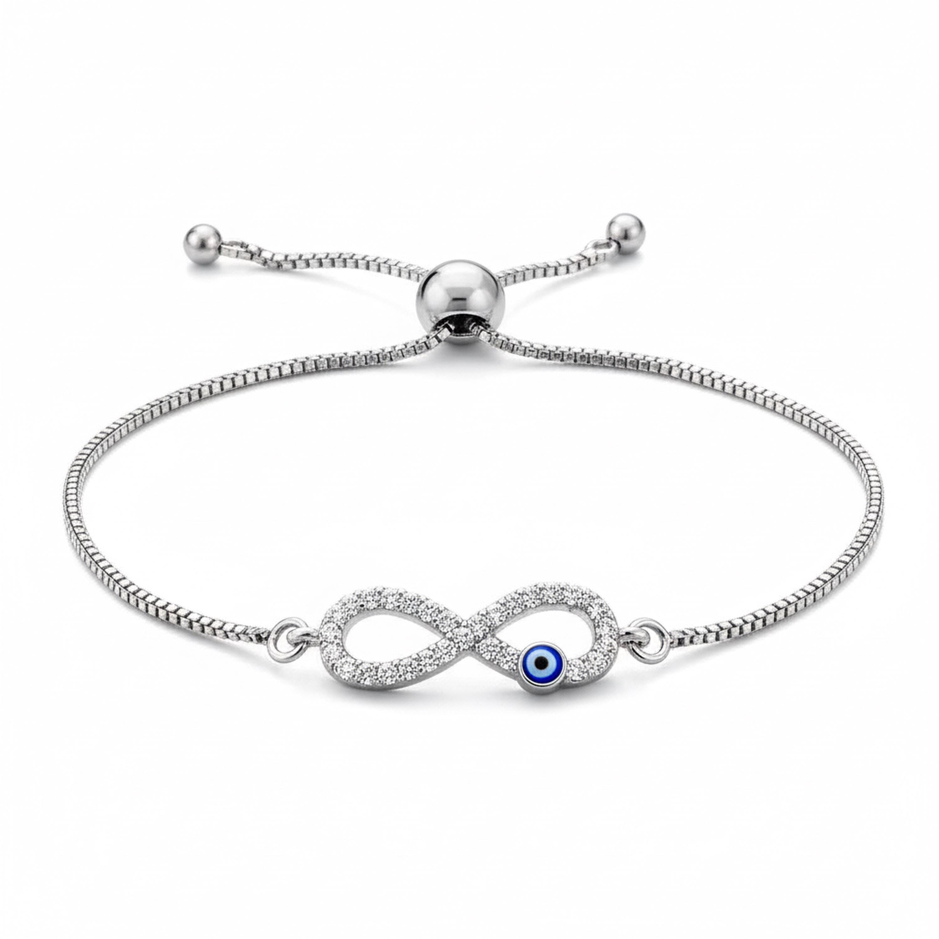 This elegant silver-tone bracelet features a sparkling infinity symbol accented with an evil eye, representing endless protection, balance, and positive energy. Designed with a smooth adjustable slider closure, it offers a comfortable, customizable fit for everyday wear.