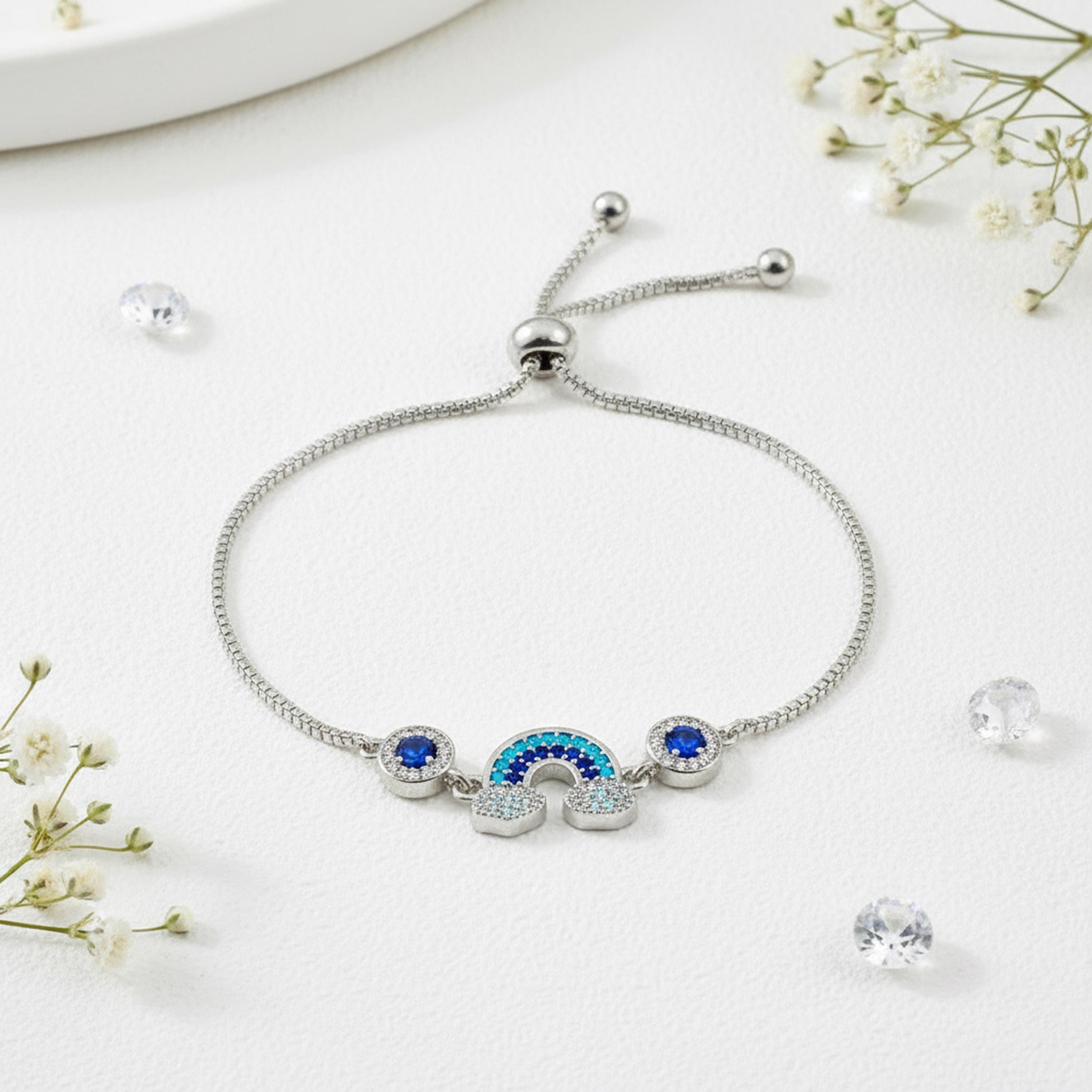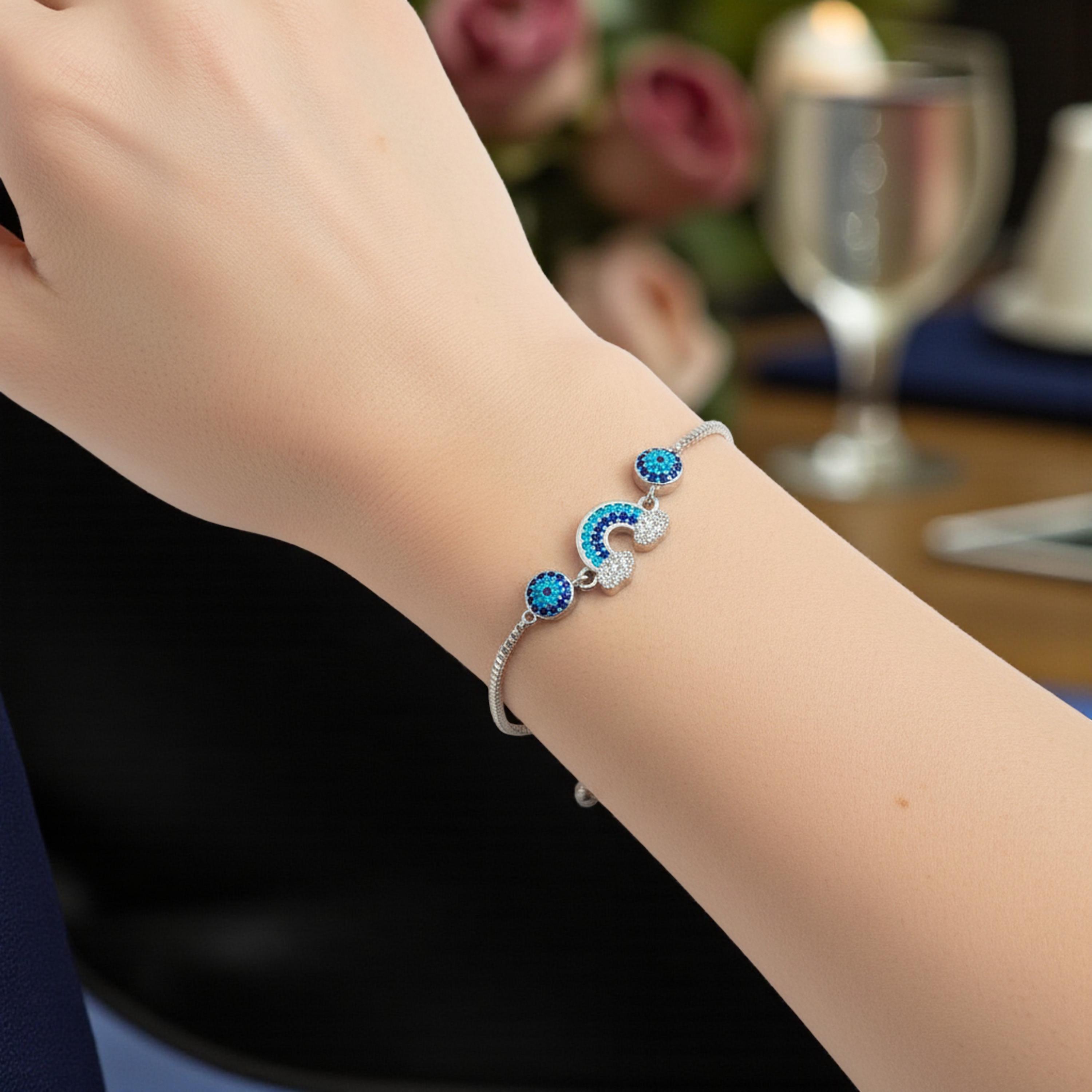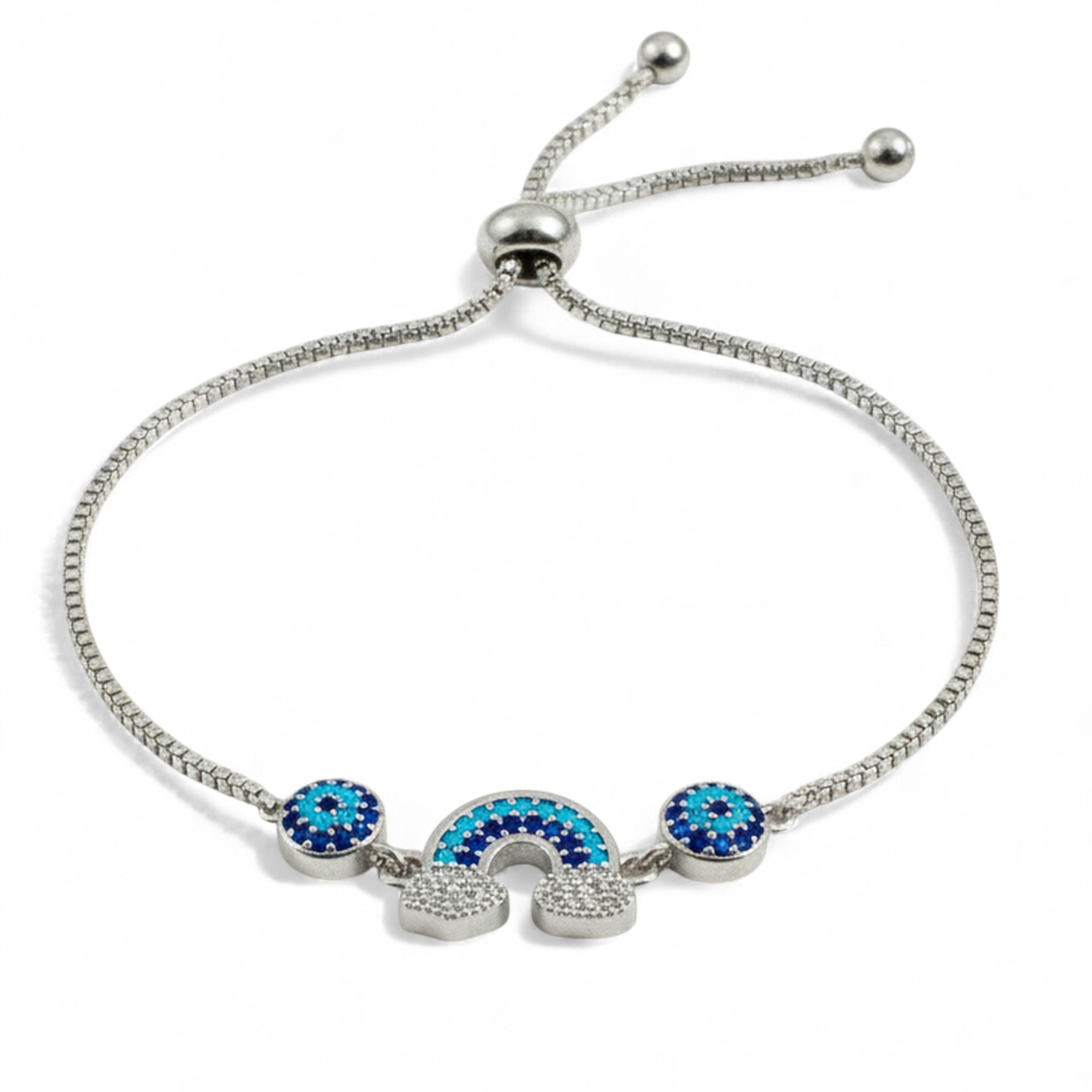 This elegant silver-tone bracelet features a rainbow-shaped evil eye centerpiece, symbolizing protection, hope, and positive energy. Designed with a smooth adjustable slider closure, it offers a comfortable, customizable fit for everyday wear.
