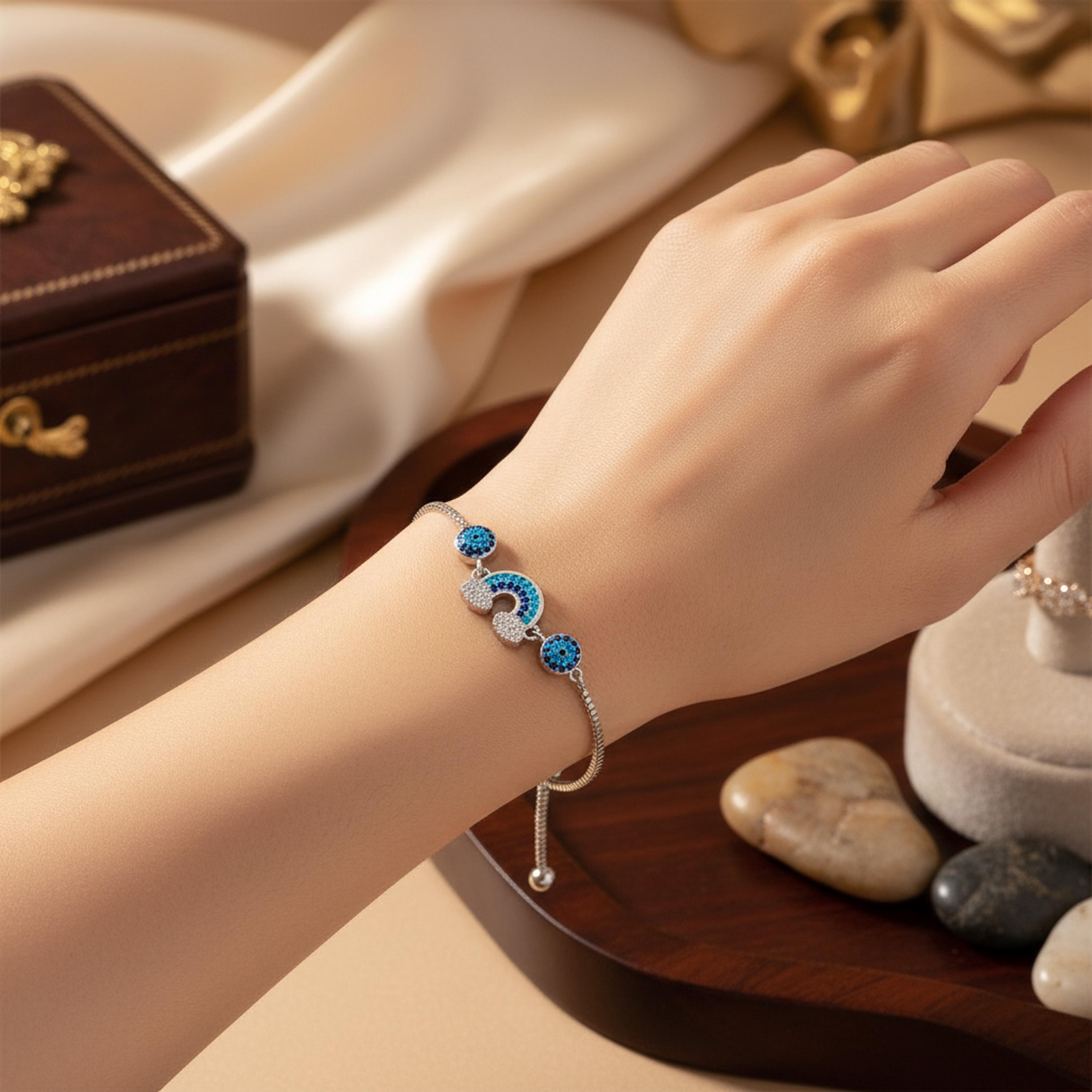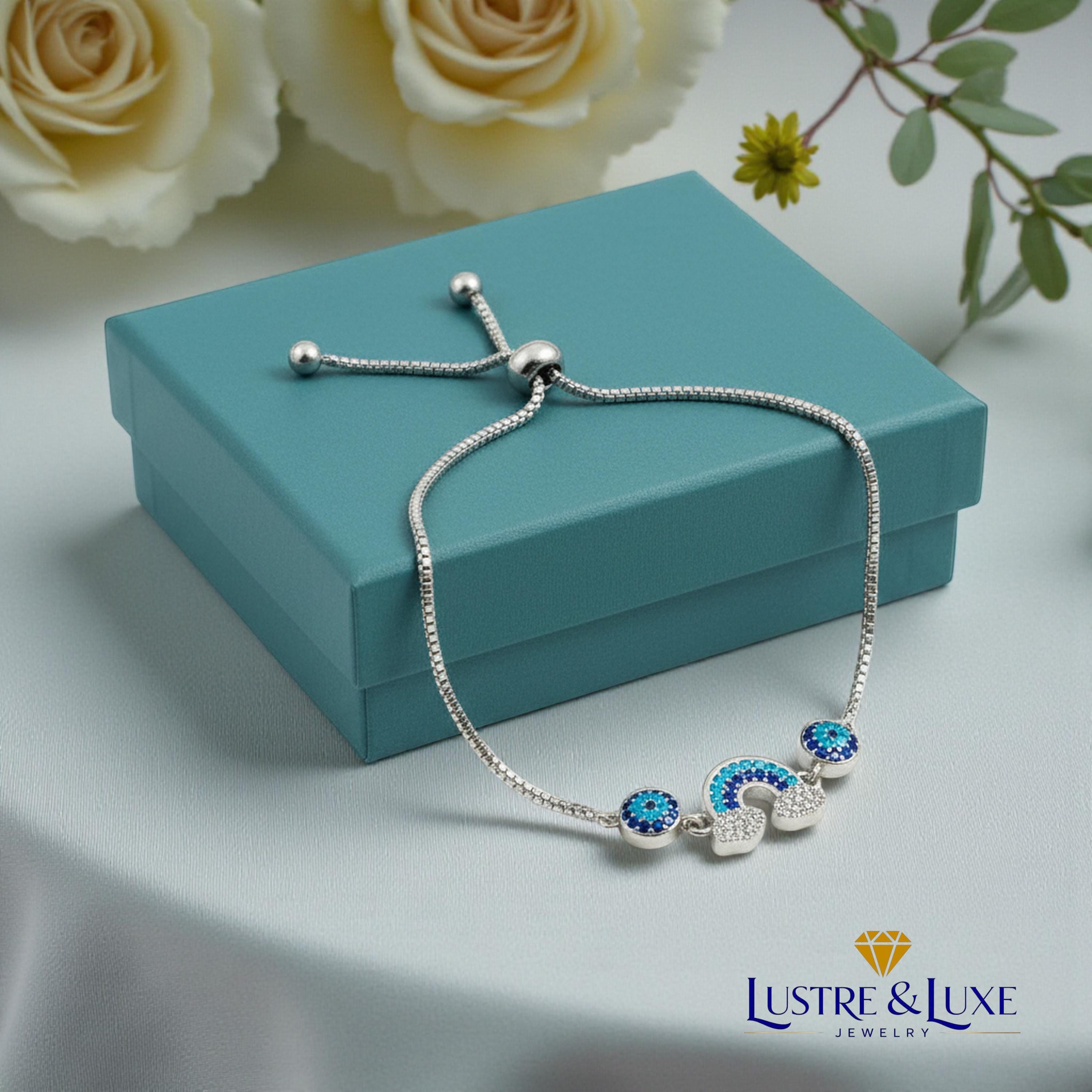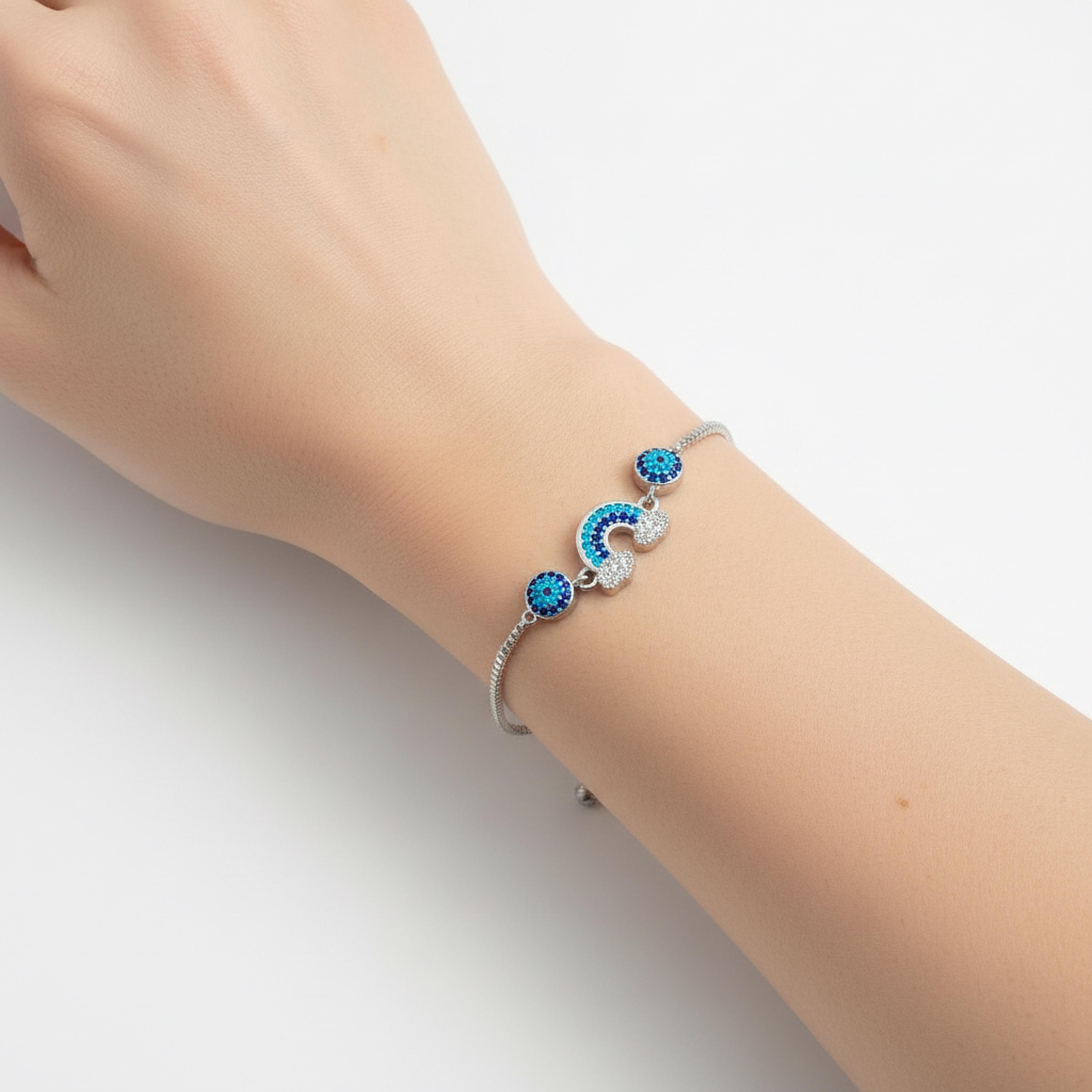 This elegant silver-tone bracelet features a rainbow-shaped evil eye centerpiece, symbolizing protection, hope, and positive energy. Designed with a smooth adjustable slider closure, it offers a comfortable, customizable fit for everyday wear.