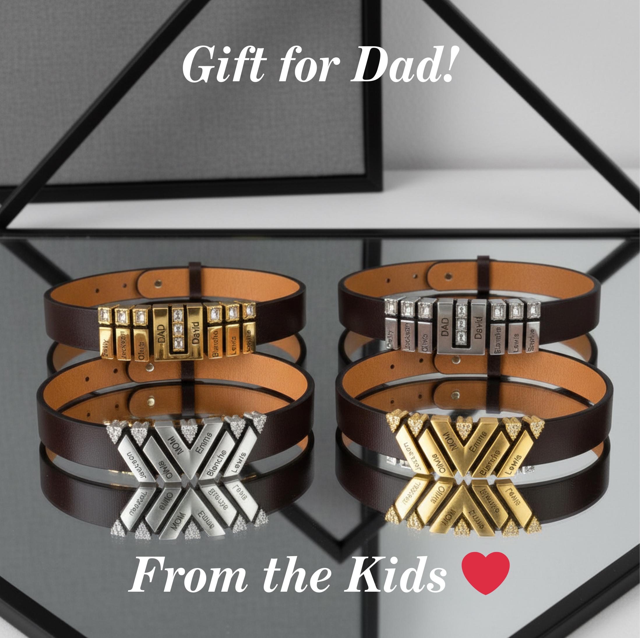 This custom leather bracelet features engraved name bars representing the people he loves most. A sentimental keepsake he can wear every day.