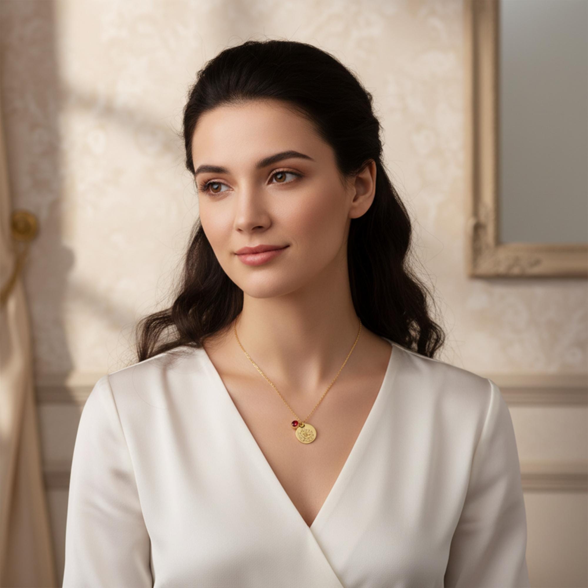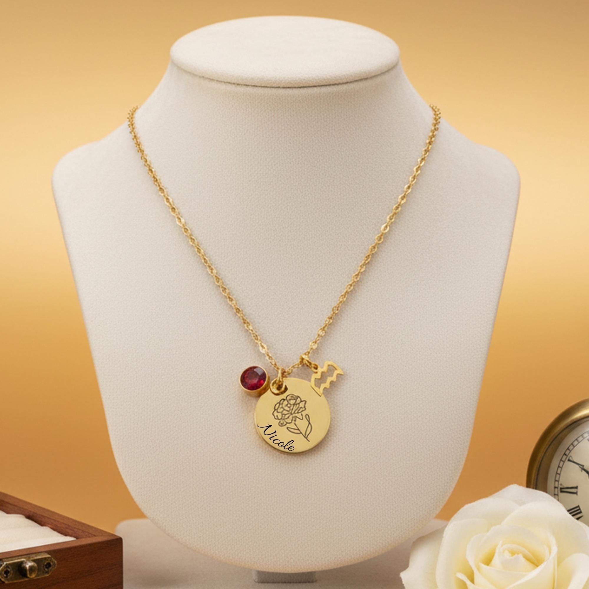 Create a truly meaningful piece with a custom necklace featuring your birth flower engraving, birthstone, and optional zodiac charm, and name engraving front and back.