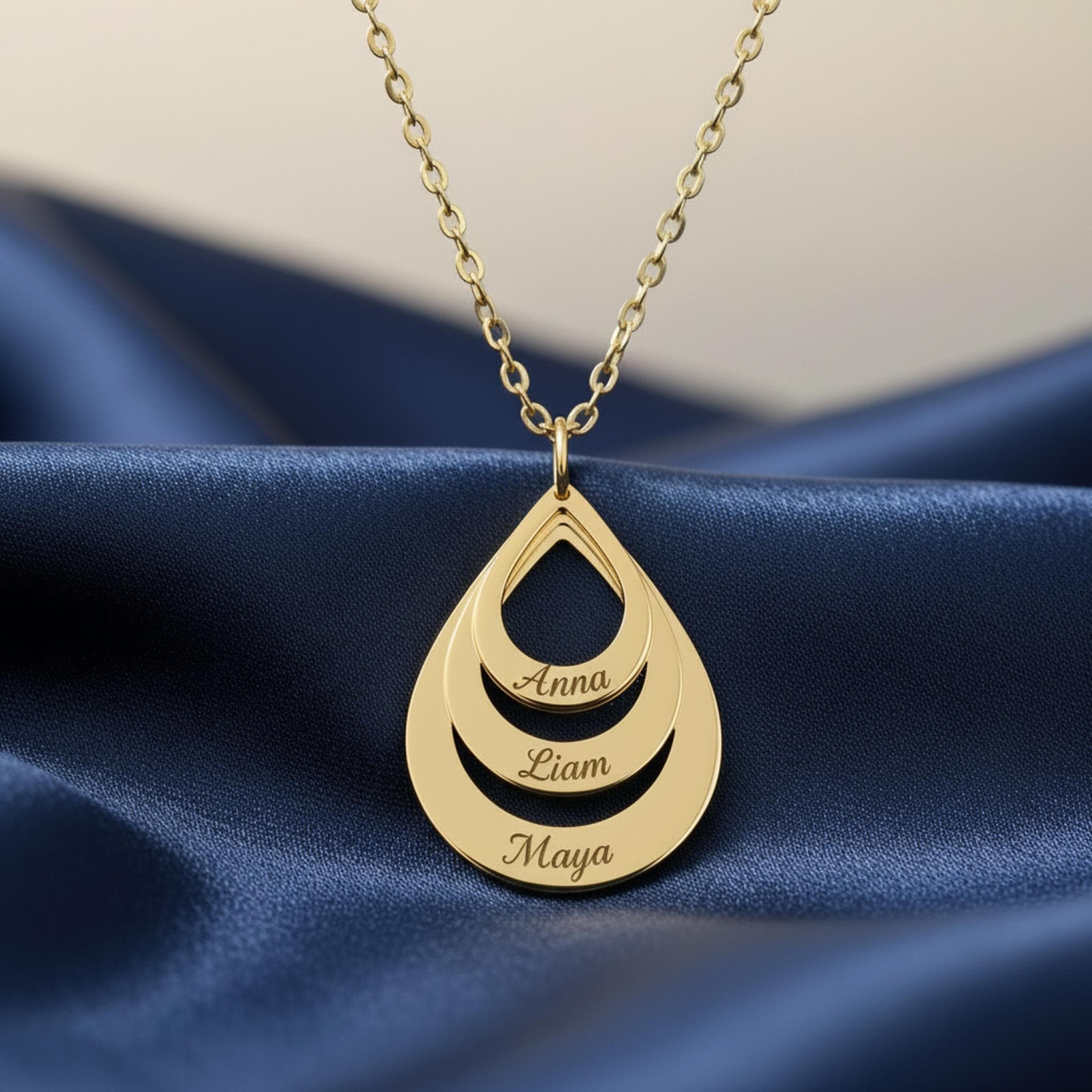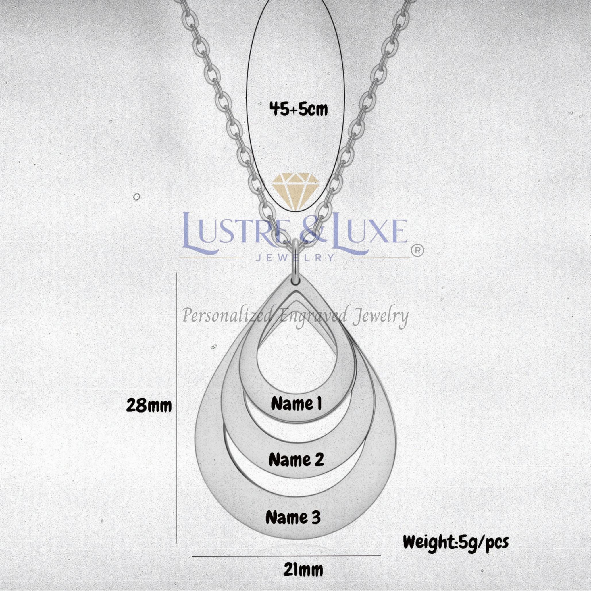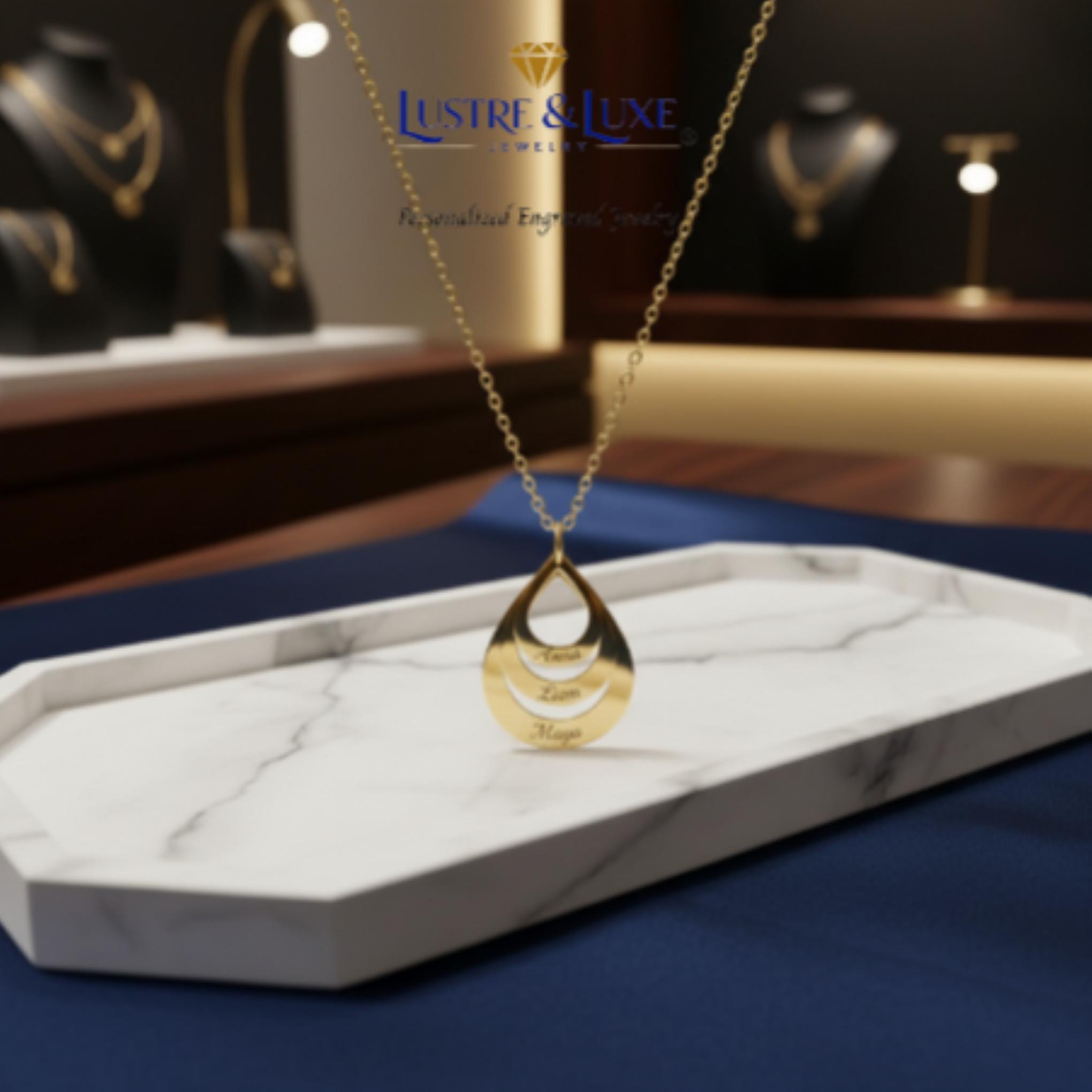 Celebrate the people who matter most with this elegant personalized teardrop pendant necklace. Featuring a layered open-drop design, this custom necklace can be engraved with up to 3 names, making it a meaningful keepsake for moms, grandmothers, wives, or anyone who loves personalized jewelry.
