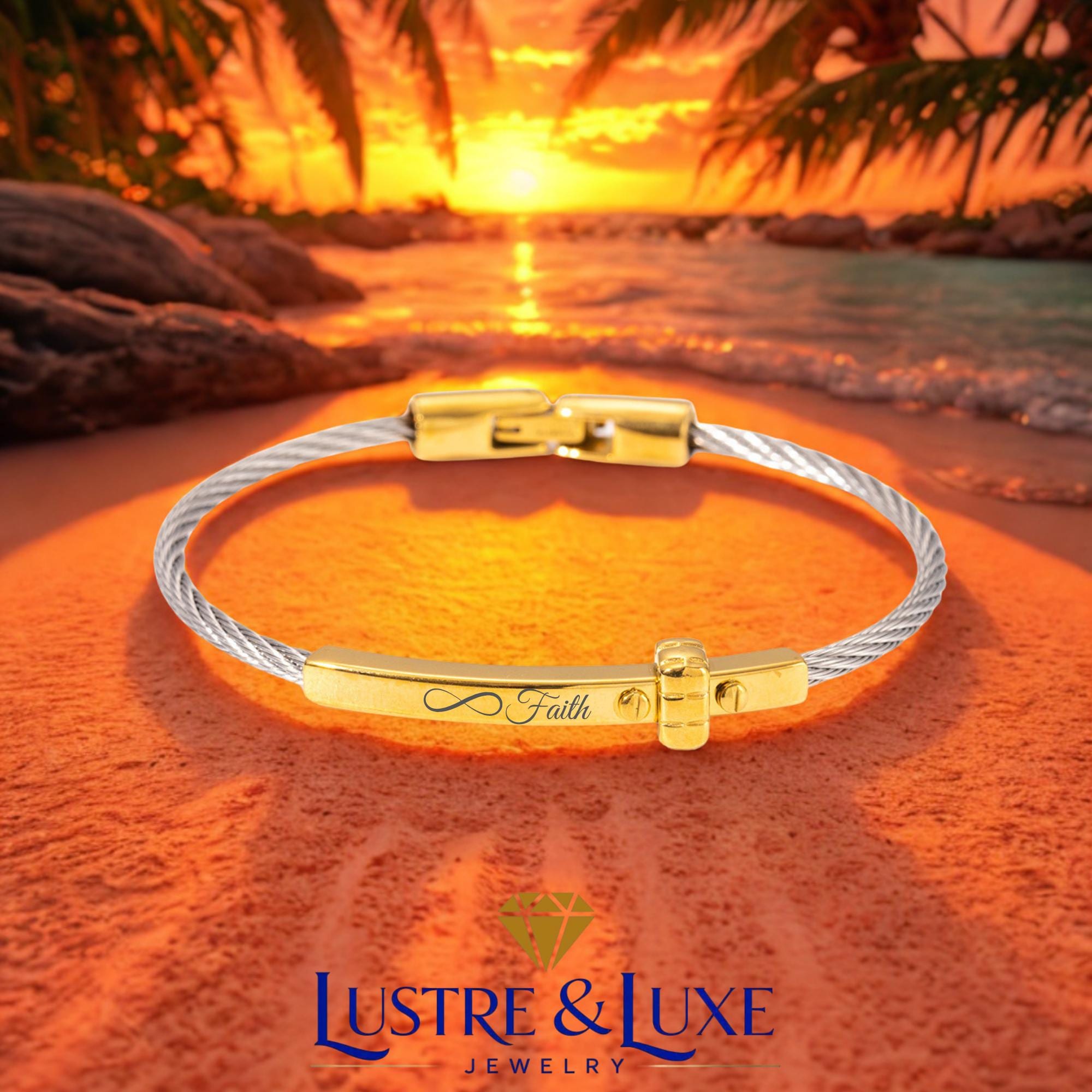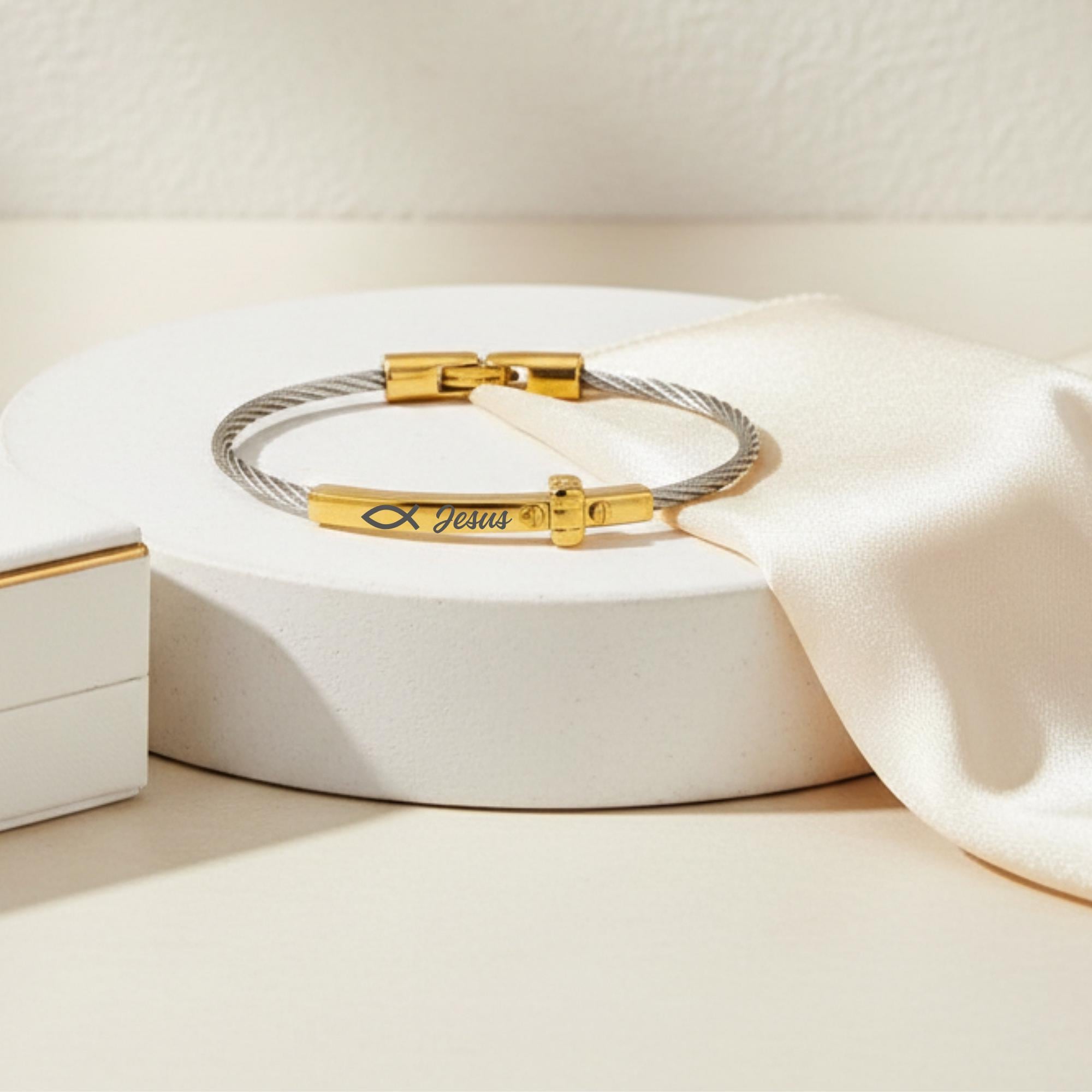 Its two-tone design makes it easy to pair with both gold and silver jewelry, while the sleek cuff style gives it a refined and modern look. Whether worn as a daily reminder of faith or given as a meaningful gift, this bracelet is a lovely piece for any jewelry collection.