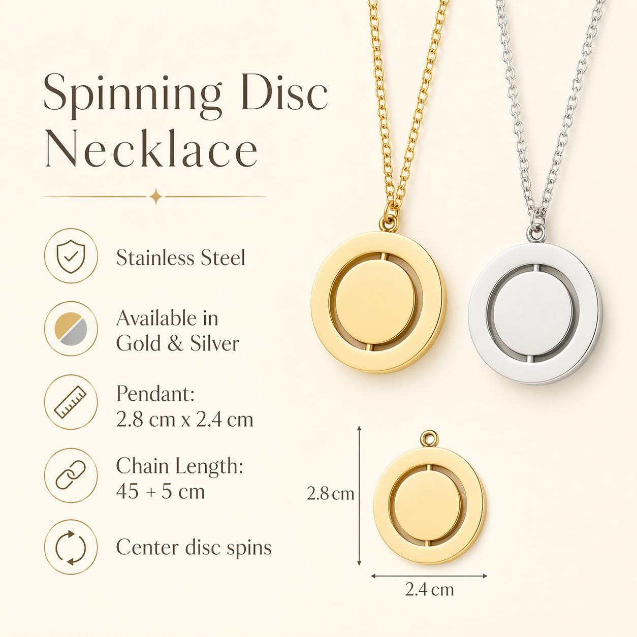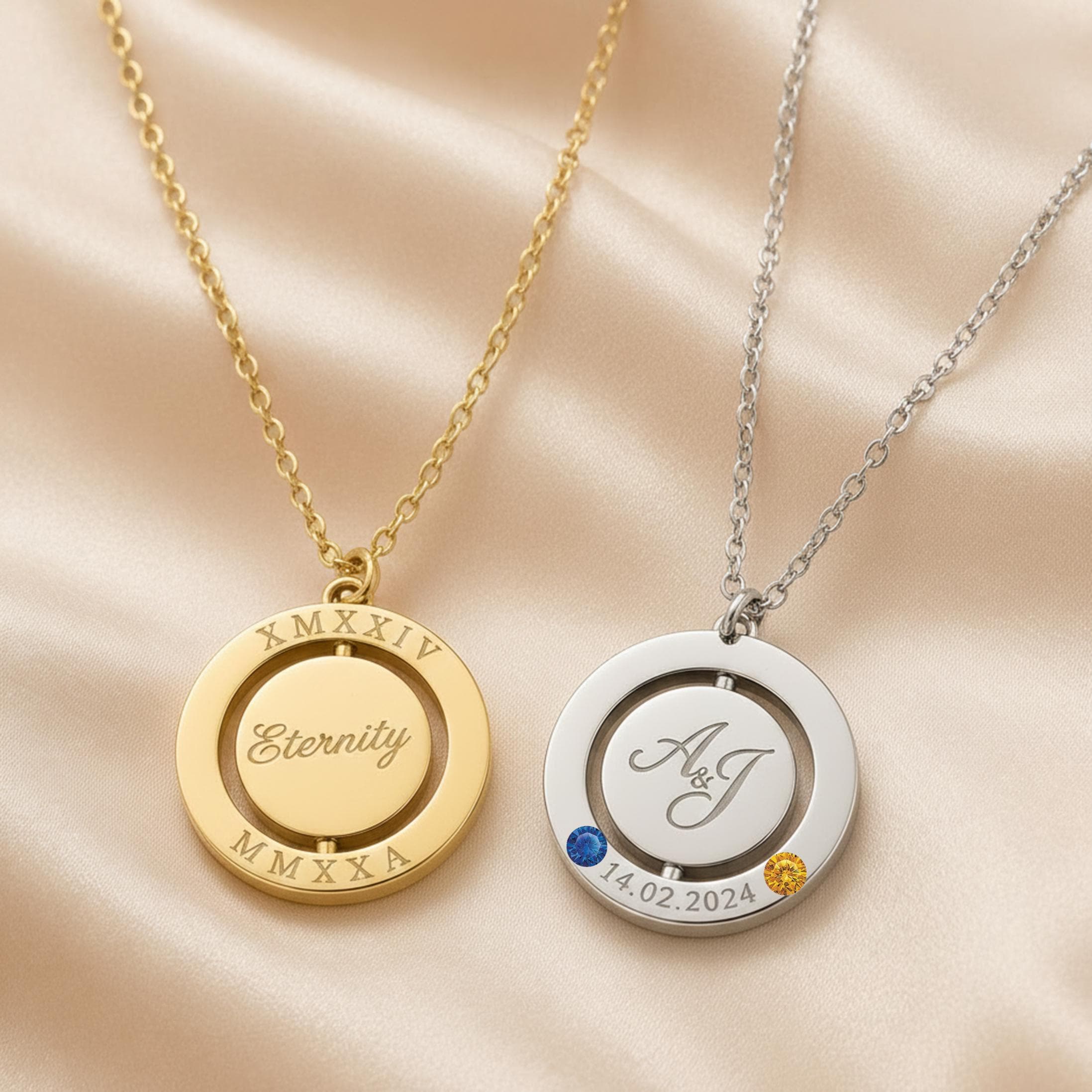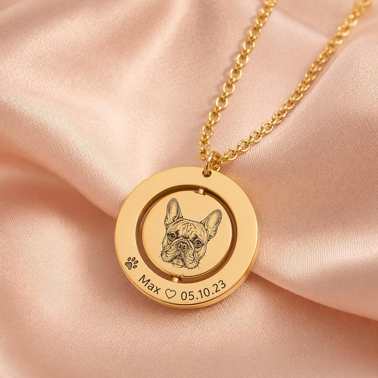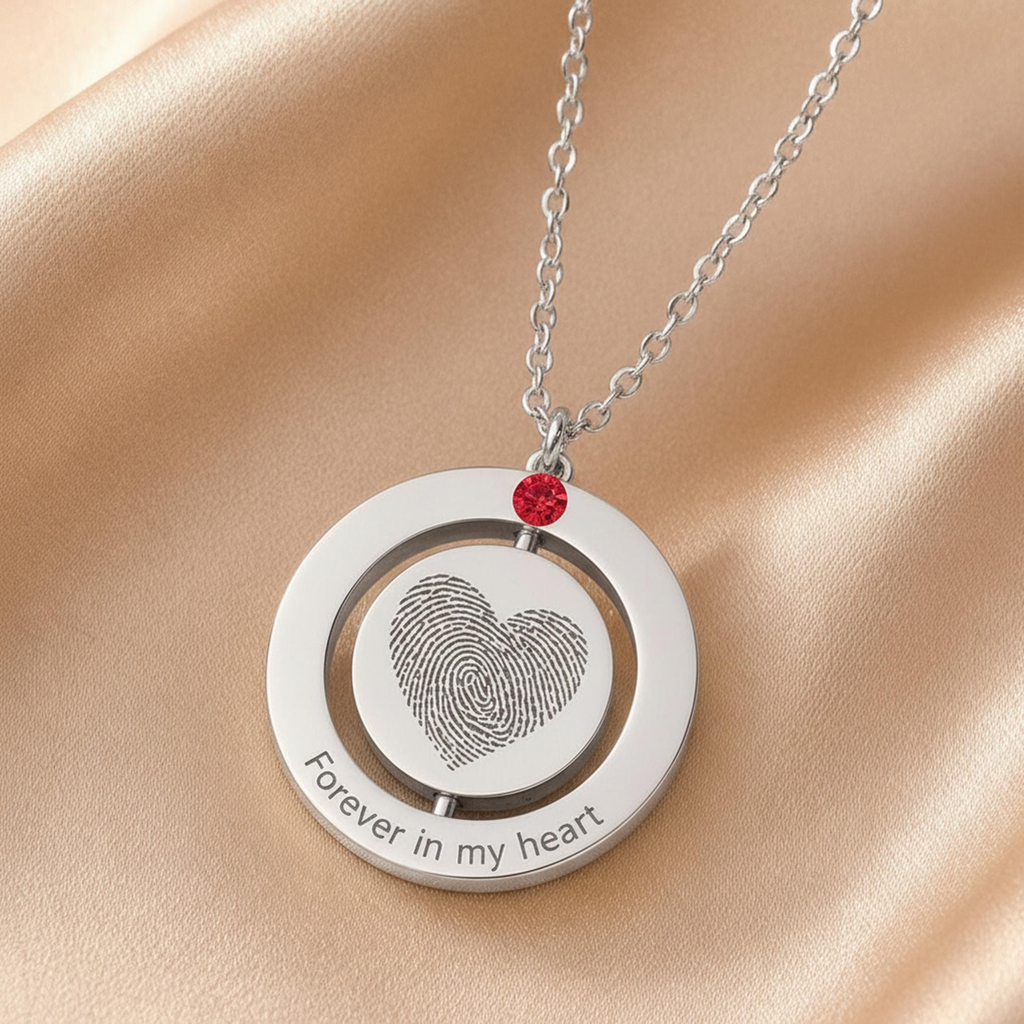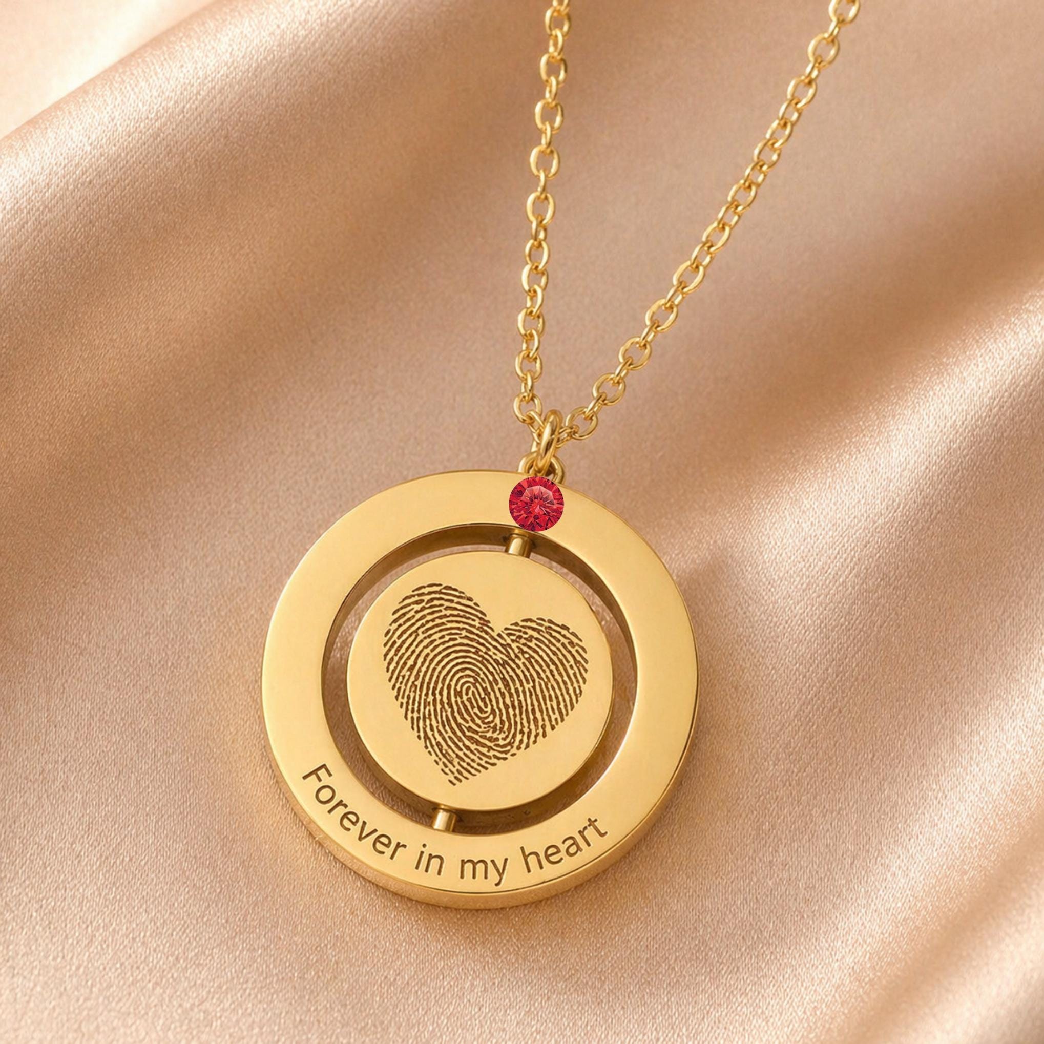 Available in gold or silver stainless steel, this necklace is a meaningful piece for memorial jewelry, pet remembrance, anniversaries, birthdays, and everyday sentimental wear. The spinning center adds a unique touch, while the optional birthstone charm makes it even more personal and special.
