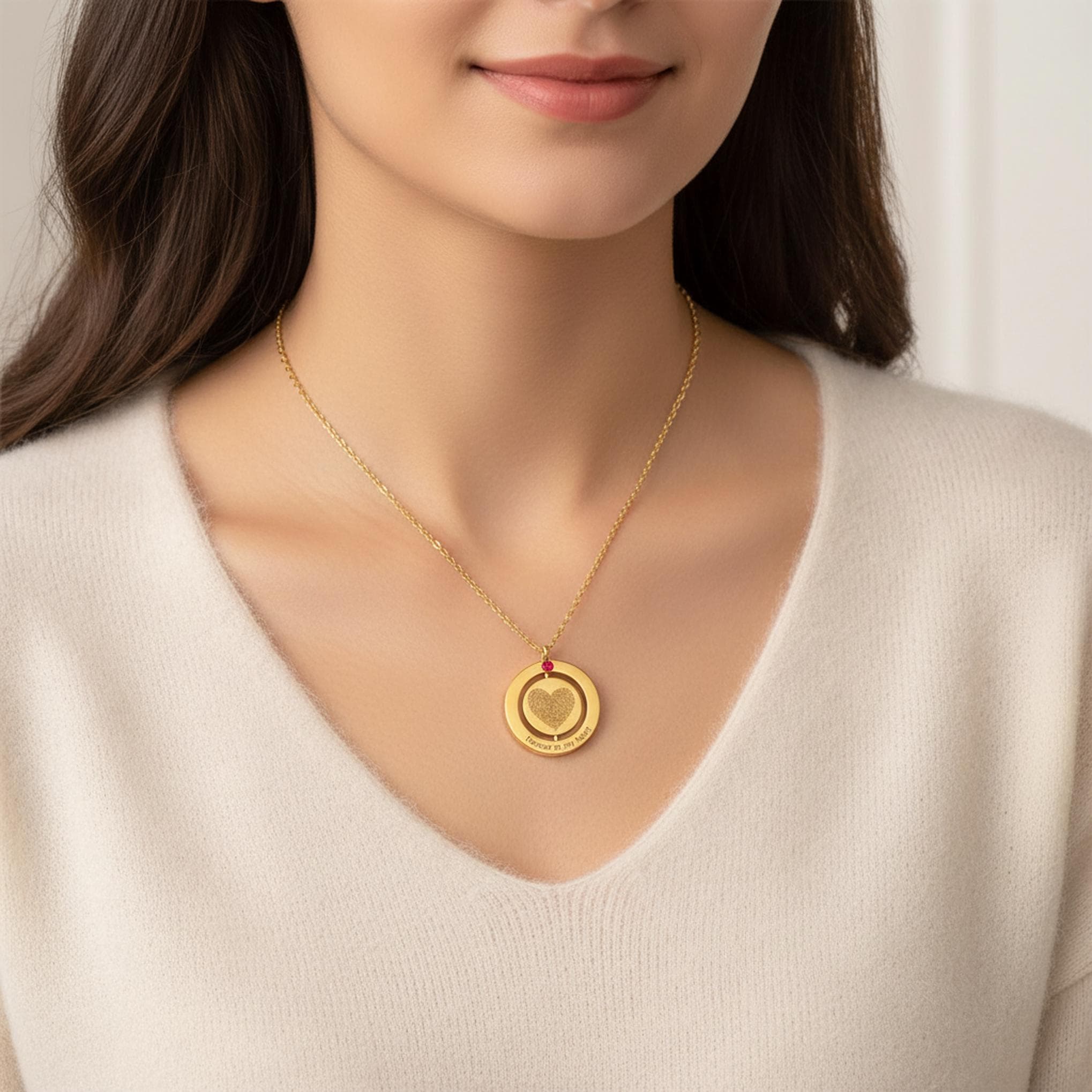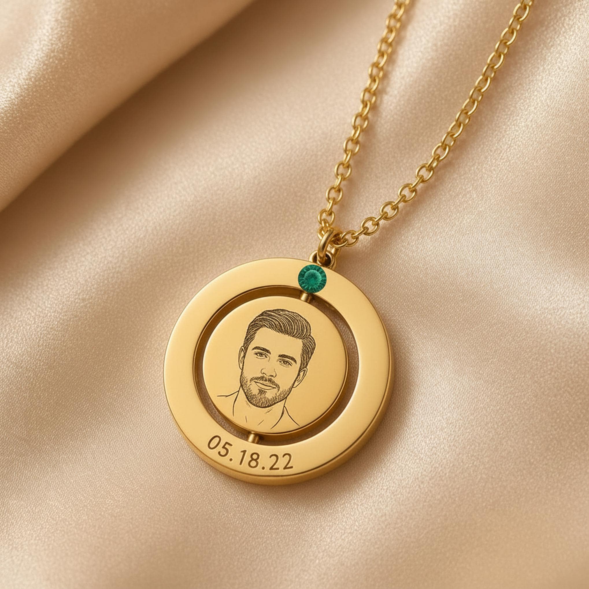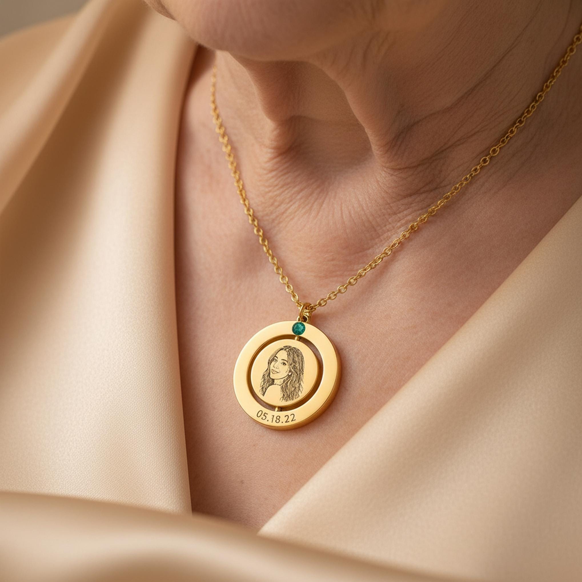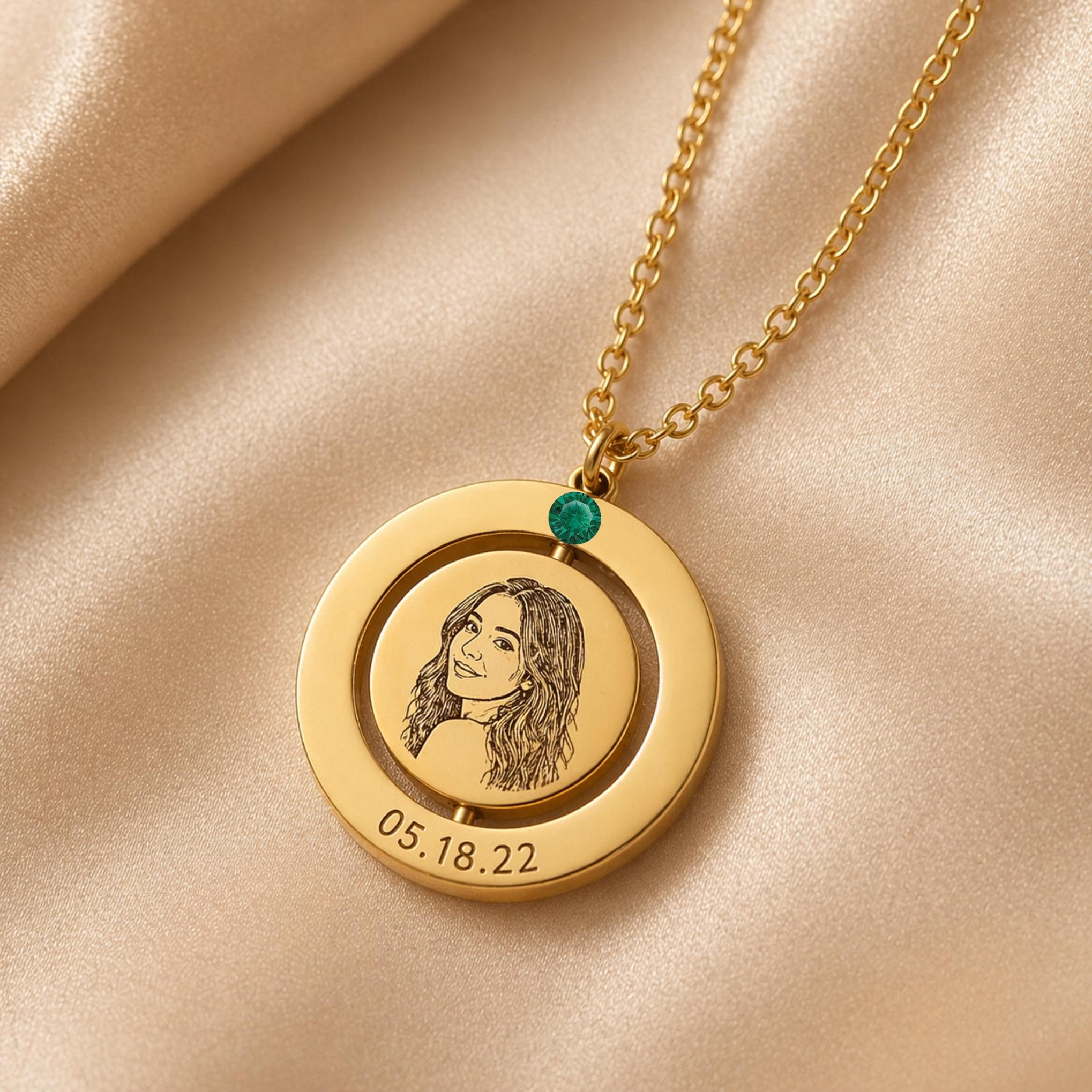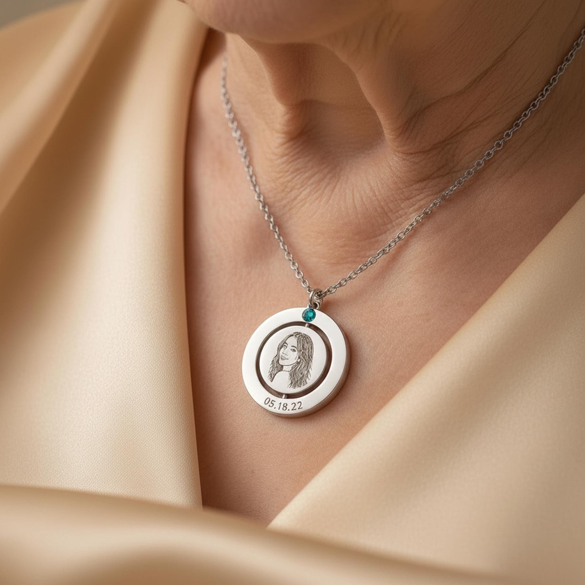 Create a one-of-a-kind keepsake with this personalized spinning disc necklace with optional birthstone charm. Designed with a smooth rotating center disc, this elegant pendant can be customized with a pet portrait, person photo engraving, fingerprint, name, date, or short message.