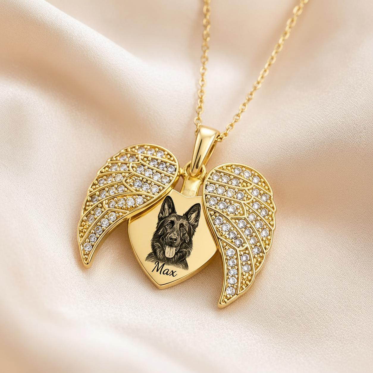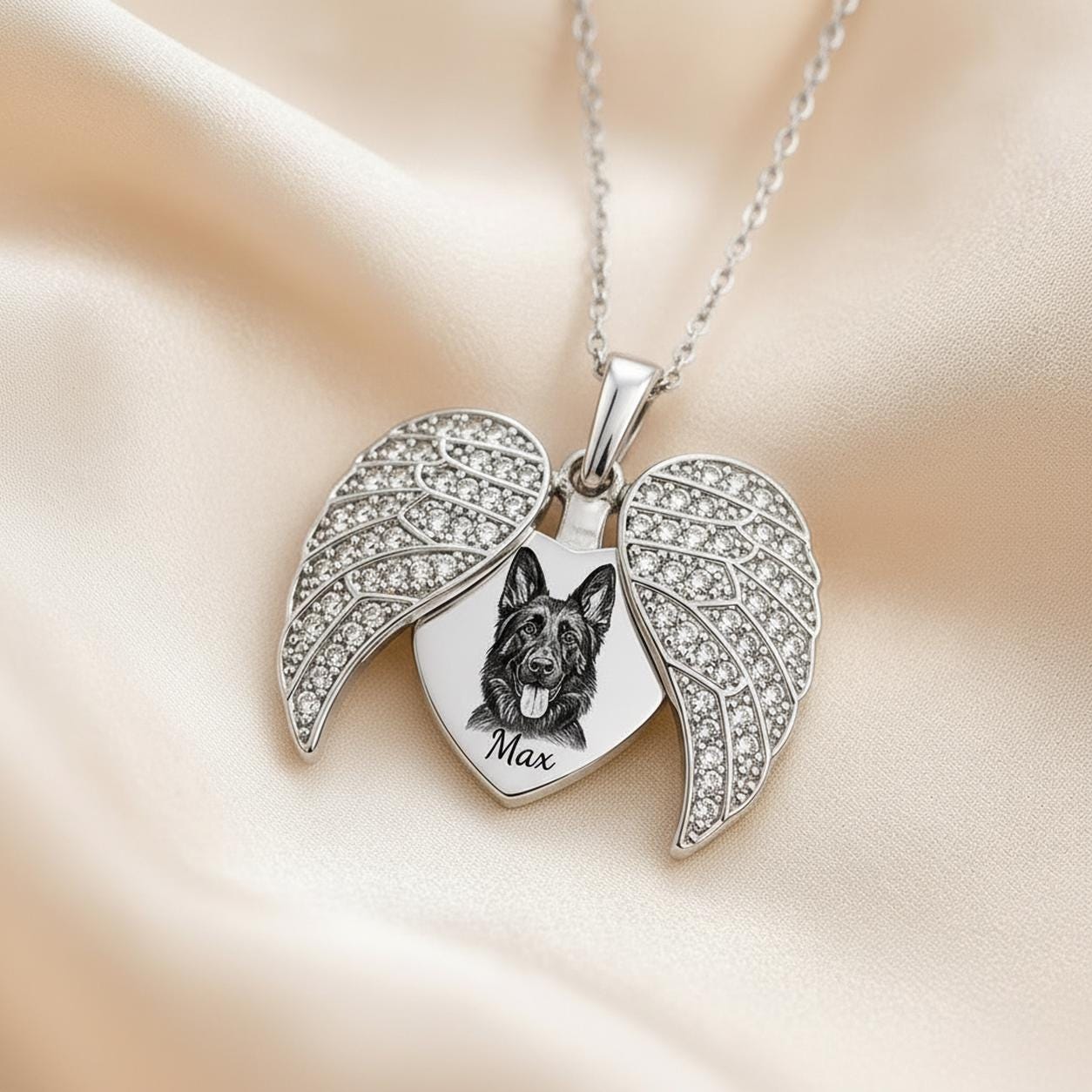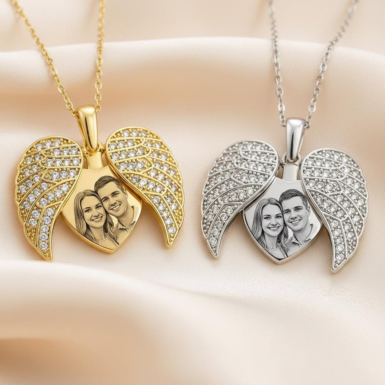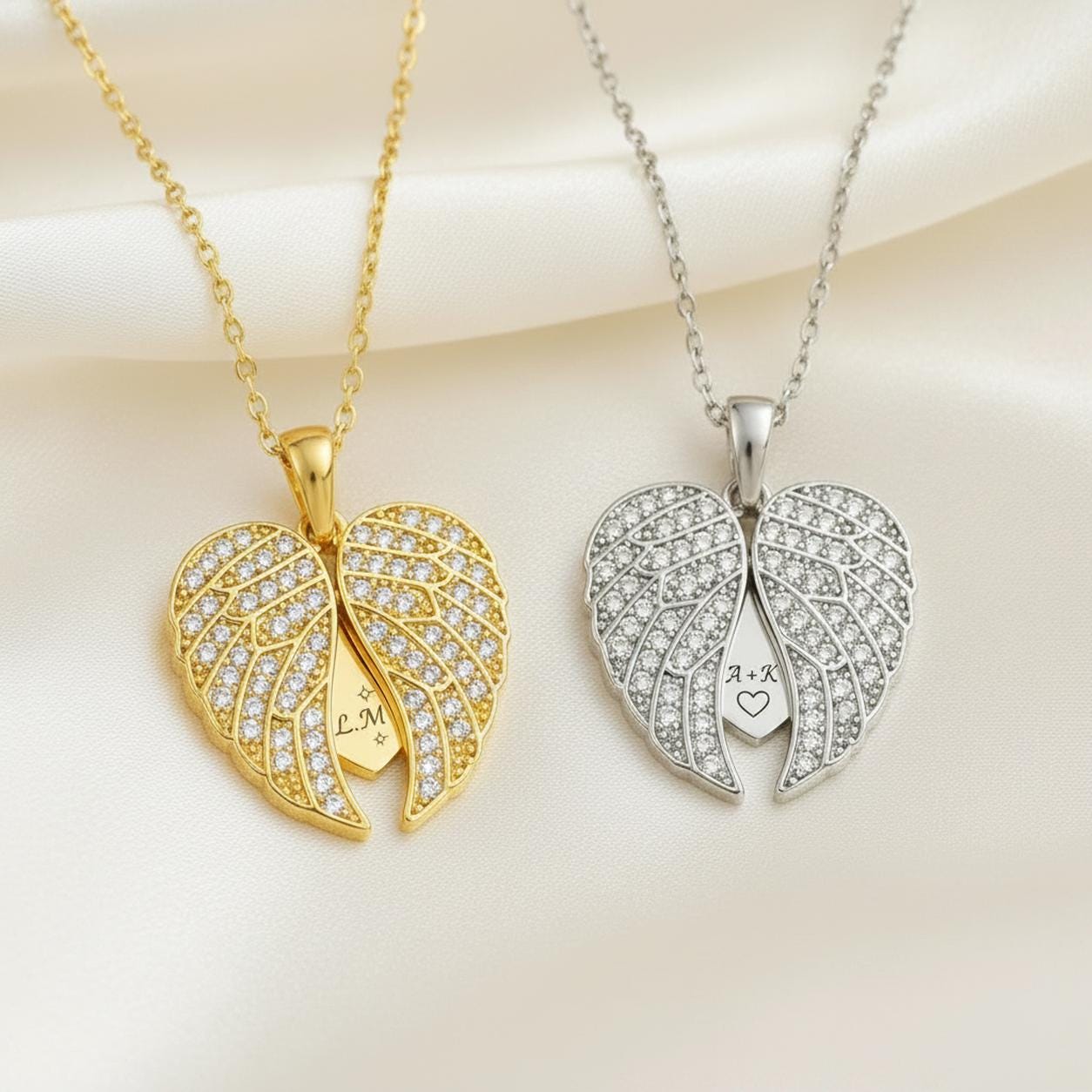 Create a meaningful keepsake with this personalized angel wing heart necklace. This elegant pendant features a beautiful wing-shaped design that opens to reveal a heart center underneath, making it a special piece for engraving and personalization.