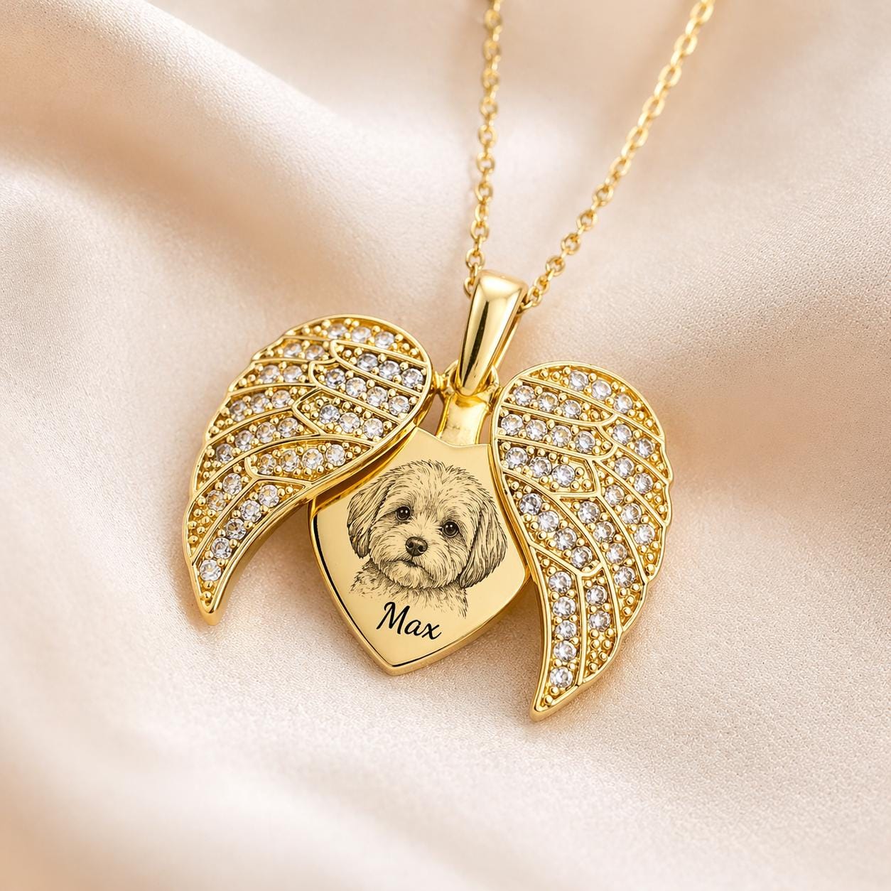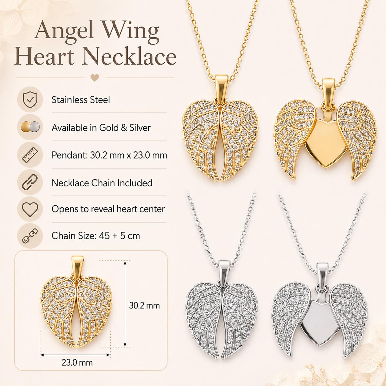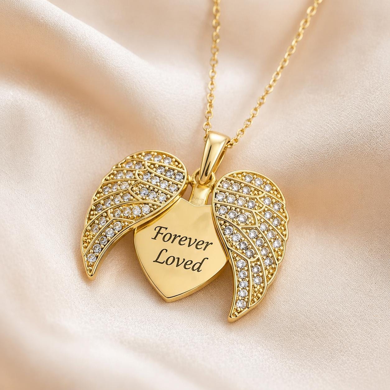 Available in gold or silver, this necklace is perfect for memorial jewelry, romantic gifts, anniversary gifts, remembrance pieces, and sentimental everyday wear. The sparkling wing details give it a beautiful, elegant look, while the hidden heart center creates the perfect place for a custom engraving.